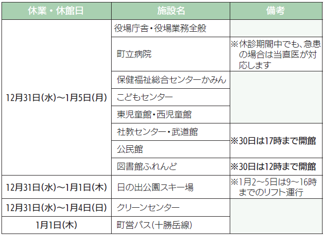 年末年始の公共施設・機関の開館、運行状況は以下のとおりです。