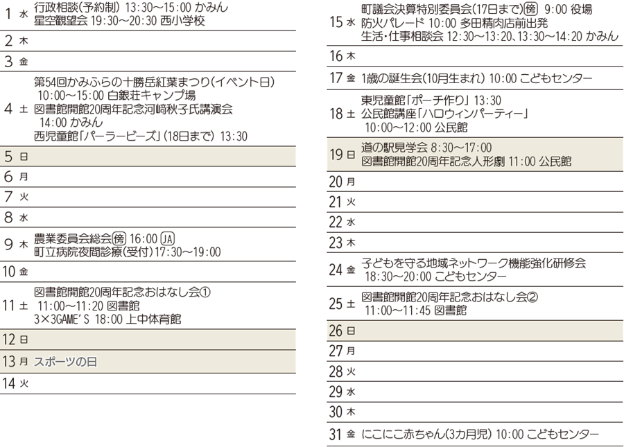 くらし 10月のまちの行事予定 1/14 次の記事 発行日 : 2025年09月25日 自治体名 : 北海道上富良野町 広報紙名 : 広報かみふらの 2025年9月25日号 (傍)…傍聴できます (JA)…JAふらの北エリア上富良野事務所 まちの行事予定は、中止、変更になる場合がありますので事前にご確認ください Tweet シェアする 期限までに納めましょう