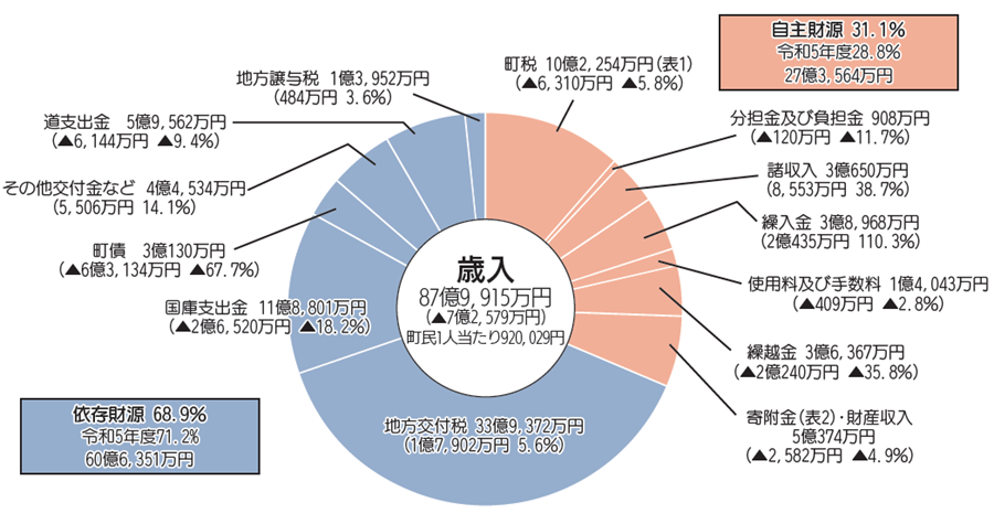 令和6年度決算における各比率は、すべて基準値を下回っており健全段階にありますが、財政状況の実態は、経常的な収入の88.3%が経常的な支出(人件費・扶助費・公債費など)に充てられ、また収入の68.9%が国や北海道から交付される依存財源で賄われていることから、財政構造は依然として厳しい状況にあります。今後も健全な財政運営に向けて、努力していきます。