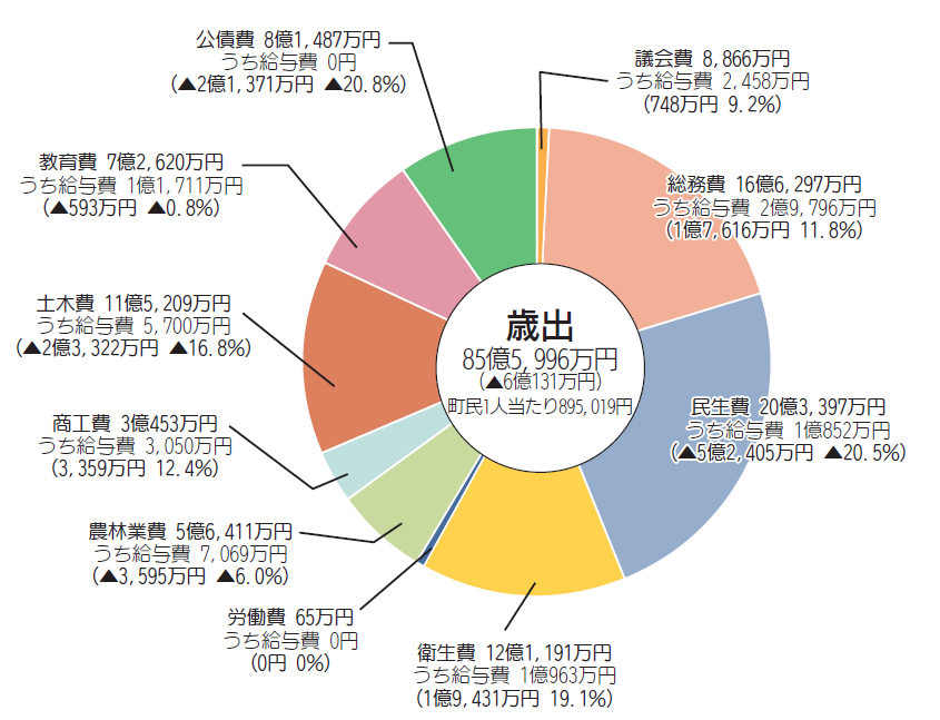 一般会計の決算状況は、歳入(町に入ってきたお金)歳出(使ったお金)ともに、前年度から比べると減少しましたが、物価高騰対策関連交付金や地方交付税の追加交付を受けたことと合わせ、令和7年3月に竣工した新町立病院改築事業の実施や各公共施設などの維持補修、物価高騰、人件費増などに対応する経費などにより、歳入・歳出ともに85億円を超える決算額となりました。
