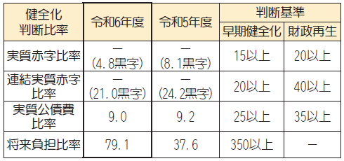 地方公共団体の財政の健全化に関する法律により決算に基づき一般会計は「健全化判断比率(表4)」、公営企業は「資金不足比率(P7)」を算定し、公表することとなっています。