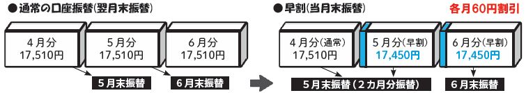 *早割申込後の最初の口座振替は、前月分(割引なし)と当月分(60円割引)の2カ月分となり、その後は当月分(60円割引)の1カ月分となります。