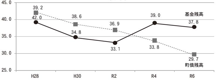 一般会計における基金残高と町債残高の推移です。
