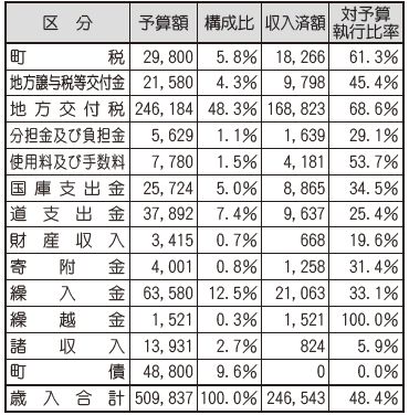 9月30日現在の一般会計予算総額は51億円です。プレミアム応援券発行事業や定額減税調整給付金事業といった事業を追加しており、当初予算48億3千万円から2億7千万円増加しています。