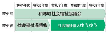 昨年3月に策定した「ふくしのまちづくり基本構想」に沿って、その中核となる福祉施設(令和10年開設予定)を整備することとなった社会福祉法人ゆうゆう(以下「ゆうゆう」という。)が事業を円滑に移行するため、左図のとおり、社協の指定期間残り3年間(令和7年4月1日から令和10年3月31日)を指定管理者として管理運営を引き継ぐことになりました。