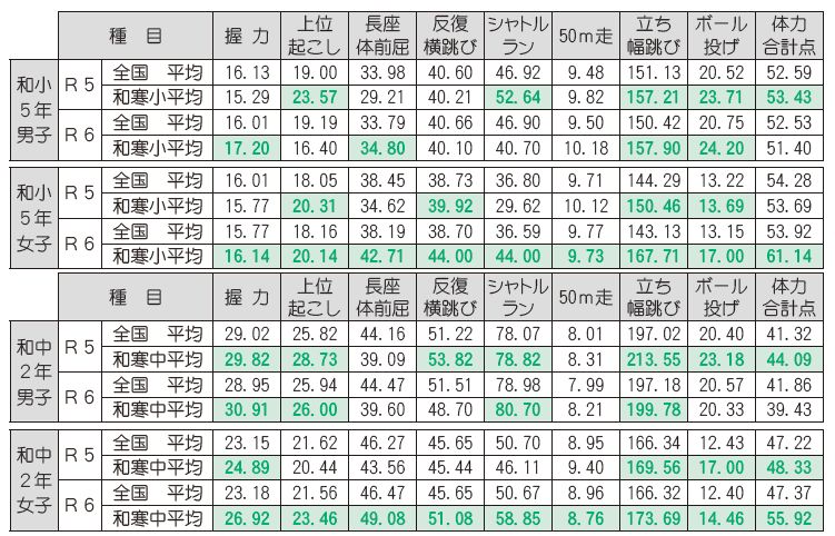 和寒町の児童生徒の実技調査の結果については、小学校・中学校の女子の結果が、全種目で全国平均を上回りました。男子については、小中学校ともに、体力合計得点はほぼ全国平均でした。小学校男子の「ボール投げ」中学校男子の「握力」は全国平均を大きく上回りました。