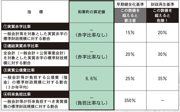 この各比率の算定値が基準を超えると、財政の健全化を図るために計画を立て、国や道の監督指導を受けることになり、行政サービスを縮小しなければならない状況になります。
