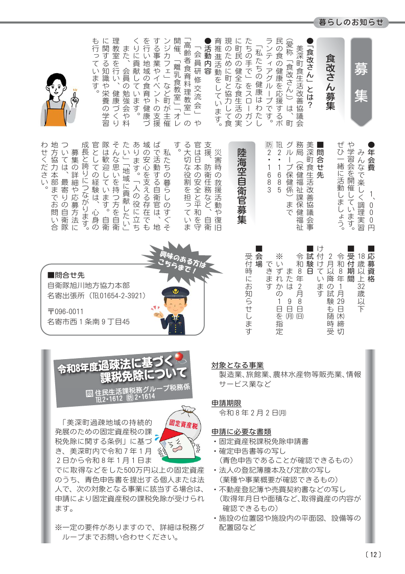 くらし 広報びふか 2026(令和8年)1月号_P.12 12/14 前の記事 次の記事 発行日 : 2025年12月25日 自治体名 : 北海道美深町 広報紙名 : 広報びふか 2026(令和8年)1月号 Tweet シェアする 広報びふか 2026(令和8年)1月号_P.11 広報びふか 2026(令和8年)1月号_P.13