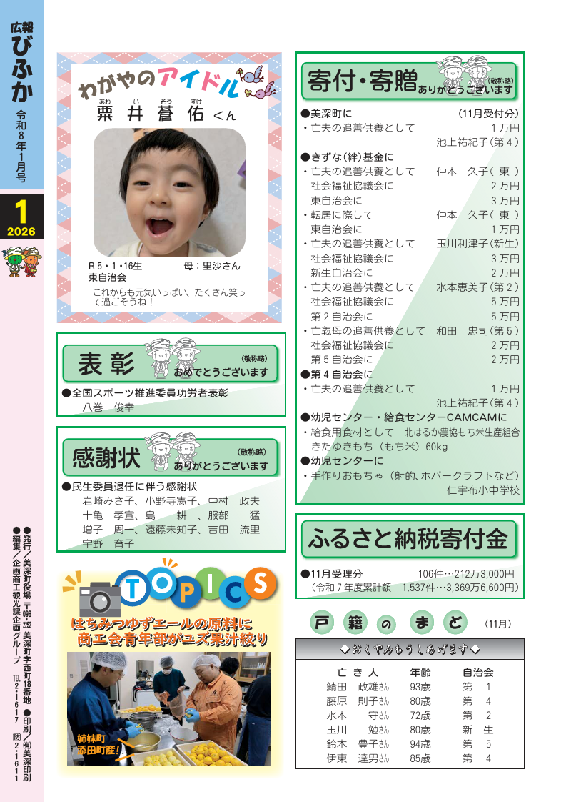 くらし 広報びふか 2026(令和8年)1月号_P.14 14/14 前の記事 発行日 : 2025年12月25日 自治体名 : 北海道美深町 広報紙名 : 広報びふか 2026(令和8年)1月号 Tweet シェアする 広報びふか 2026(令和8年)1月号_P.13
