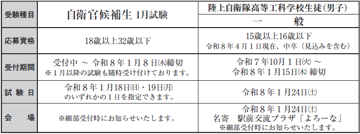 しごと 自衛官などを募集します 17/24 前の記事 次の記事 発行日 : 2025年11月28日 自治体名 : 北海道中川町 広報紙名 : 広報ナカガワ 令和7年12月号 興味のある方は、お気軽に下記までご連絡ください。 問合せ:自衛隊旭川地方協力本部 名寄出張所 〒096-0011 名寄市西1条南9丁目45 【電話】01654-2-3921 Tweet シェアする 10月の入札・契約結果についてお知らせします 企業版ふるさと納税による寄附をいただきました