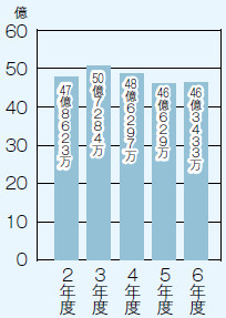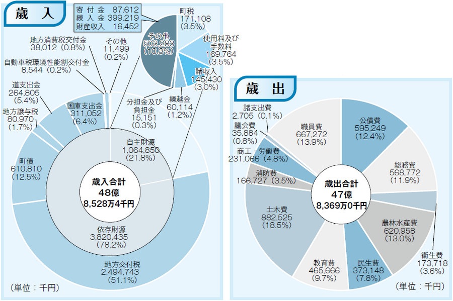 令和6年度の一般会計の決算は、歳入決算額が48億8,528万4千円、歳出決算額が47億8,368万9千円となり、歳入から歳出を差し引いた収支は1億159万5千円の黒字となりました。