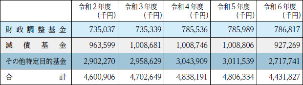 基金(町の貯金)は、財源が不足する年度に年度間の不足を補う「財政調整基金」と町債(まちの借金)の償還財源を確保し借金の返済に充てる「減債基金」、また、使用目的が決まっている「特定目的基金」があります。
