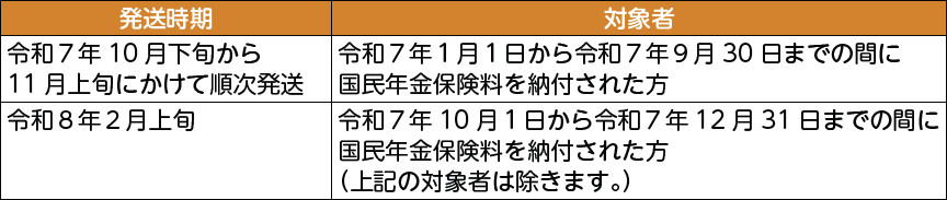 このため、日本年金機構から、次のスケジュールで「社会保険料(国民年金保険料)控除証明書」を対象者宛てに発送されますので、お手元に届きましたら、大事に保管し、年末調整や確定申告の際に使用してください。