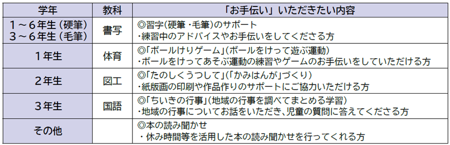 (1)1・2年生の国語で昔の遊びについて学習します。かるたやけん玉、おはじきなど、昔の遊びの指導や一緒に遊ぶお手伝いをお願いしたいです。