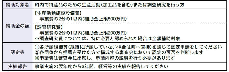 町では、特産品振興のための生産活動や調査研究を支援し、町特産品のブランド化を図り、雇用機会拡充とともに地域経済の振興につながることを目的とした補助事業を実施しておりますので、積極的に活用されますようお知らせいたします。