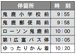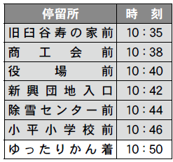 鬼鹿・臼谷・小平方面 お帰り時刻 14:30