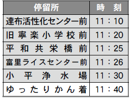 予約:本郷・平和・寧楽・達布方面は予約制といたします。運行日の午前9時までに達布支所(【電話】58-1111)または、ゆったりかんフロント(【電話】56-9111)にお電話いただけた場合のみ送迎いたします。