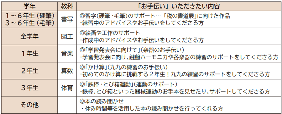※授業の実施時期などによっては、お手伝いいただけない場合もございますので、ご了承ください。
