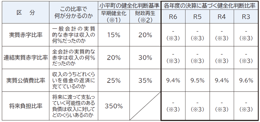 ※2 いずれかの比率が基準を超えると、国の管理下で計画的に財政の健全化を図る「財政再生団体」となります。