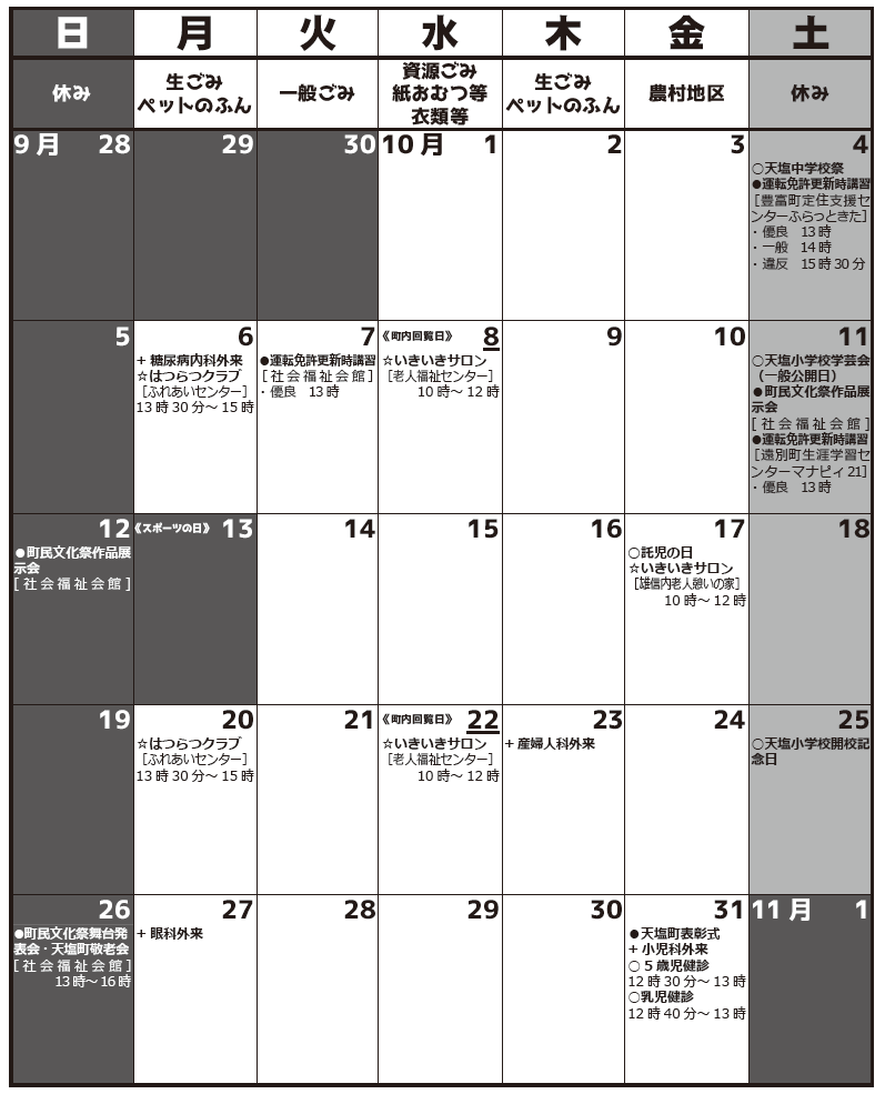 くらし 町民カレンダー 令和7年10月 7/18 前の記事 次の記事 発行日 : 2025年09月24日 自治体名 : 北海道天塩町 広報紙名 : 広報てしお 2025年10月号 ・日程は変更となる場合があります。 ・ごみは当日の朝8時までに出してください。 ・10月の回覧日は8日と22日です。 ・あいあいクラブ…こども園→火~木、雄信内→月 Tweet シェアする 運動教室通信 こんにちは保健師です