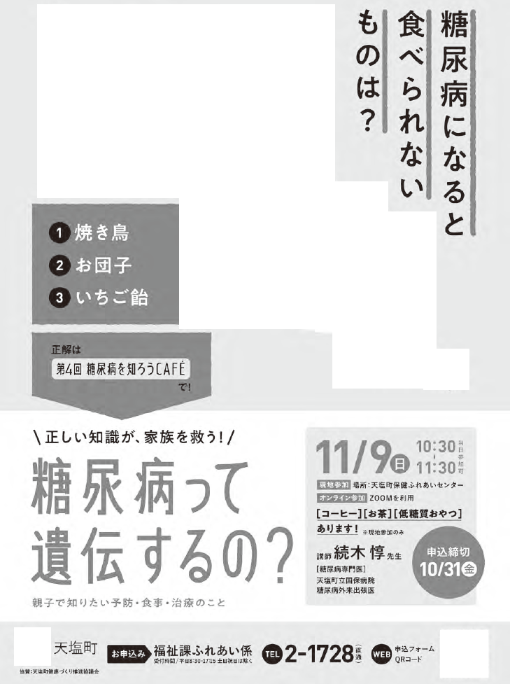 今年初めて来る方もいると思うので、「糖尿病とは?」「合併症って何?」という基礎的なことに加え、「糖尿病と遺伝の関係性」、先ほどお話した、地元の産業振興(仕事)と糖尿病の予防・治療の両立に向けたベクトル合わせのお話ができればと思っています。