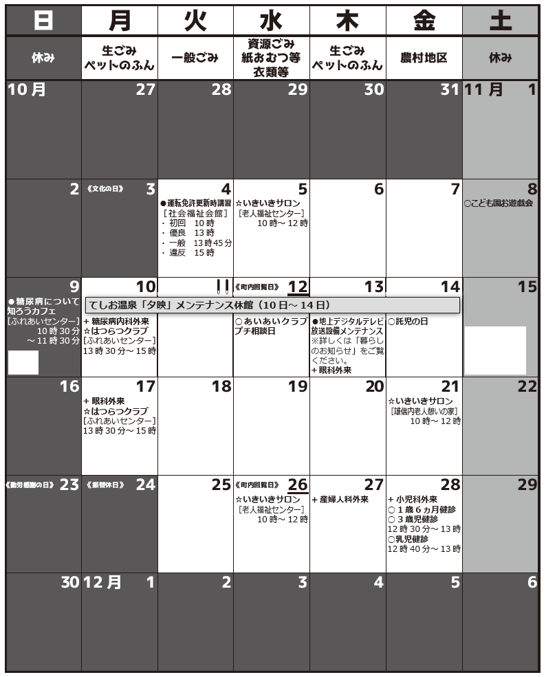 くらし 町民カレンダー 令和7年11月 6/16 前の記事 次の記事 発行日 : 2025年10月29日 自治体名 : 北海道天塩町 広報紙名 : 広報てしお 2025年11月号 ・日程は変更となる場合があります。 ・ごみは当日の朝8時までに出してください。 ・11月の回覧日は12日と26日です。 ・あいあいクラブ…こども園→火~木、雄信内→月 Tweet シェアする 協力隊通信 こんにちは地域包括支援センターです