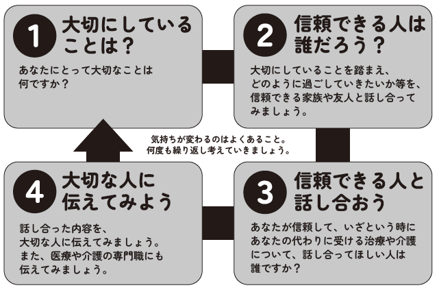 話し合いの時期は、(1)元気で時間的余裕がある時(健康なすべての人)(2)病気が悪化した時(高齢期や疾病、障害を持つ人)(3)人生の最終段階。人生の節目(就職・退職・結婚・出産など)も良い機会となるでしょう。