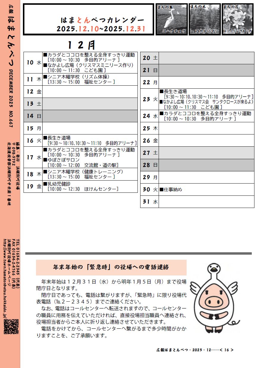 くらし 広報はまとんべつ 12月号(令和7年12月10日発行)Vol.667 P.16 16/16 前の記事 発行日 : 2025年12月10日 自治体名 : 北海道浜頓別町 広報紙名 : 広報はまとんべつ 12月号(令和7年12月10日発行)Vol.667 Tweet シェアする 広報はまとんべつ 12月号(令和7年12月10日発行)Vol.667 P.15