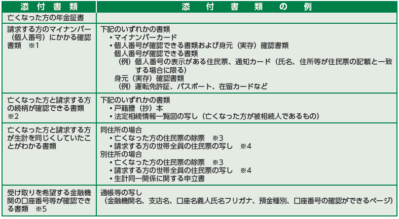 ※3 亡くなった方の住民票の除票は、日本年金機構に亡くなった方の個人番号(マイナンバー)が収録されている場合、または請求する方の世帯全員の住民票の写しに含まれている場合は不要です。