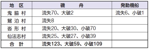 この津波は島全体で300隻近くの漁船を流失・破損させました。特に被害が大きかったのは、鬼脇、仙法志、沓形の各村です。当時の漁船の被害状況は以下の通りです。