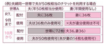 ・10月の改正で、チケットは個々に配付されますが、家族内で通算してチケットを使用できるため、夫のチケットが無くなり妻のチケットが余っている場合、夫が妻の分を使用できるようになります。