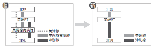 3路線を美幌バスターミナル(BT)を中継とした2路線に統合されます。