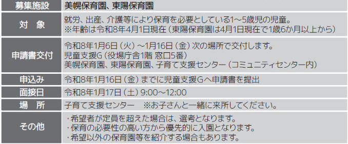 子育て 町立保育園 新入園児募集 41/60 前の記事 次の記事 発行日 : 2025年12月01日 自治体名 : 北海道美幌町 広報紙名 : 広報びほろ 2025年12月号 問合せ:社会福祉課 児童支援G 【電話】77-6541 Tweet シェアする 美幌町地域包括支援センターだより 子育て支援センター ぽかぽか