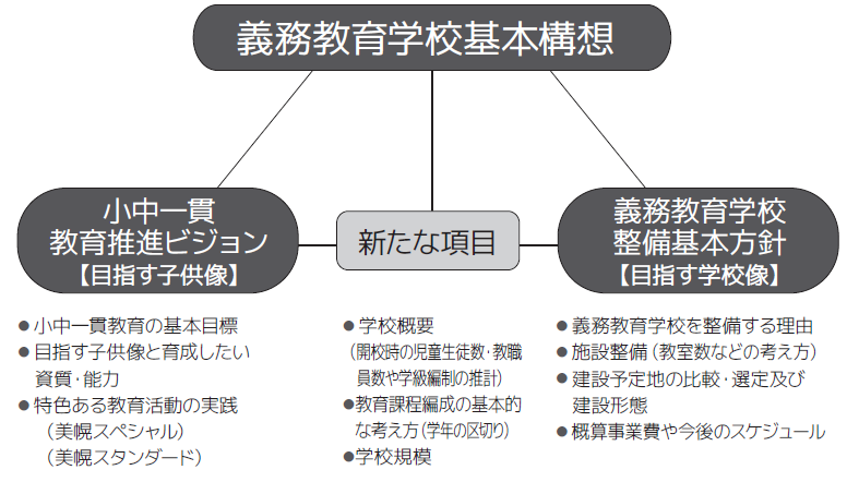 小中一貫教育推進ビジョン(令和6年7月策定)と義務教育学校整備基本方針(令和7年3月策定)の要素を取り入れながら、開校時の学校概要や教育課程編成の基本的な考え方などの新たな項目を盛り込み、この後基本構想案としてまとめます。