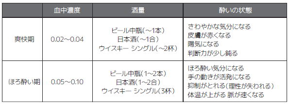 「酔い」の程度では「爽快期」までが適量範囲と言えます。ほろ酔い期を過ぎると悪酔いや様々な健康障害を起こしやすいと言われています。