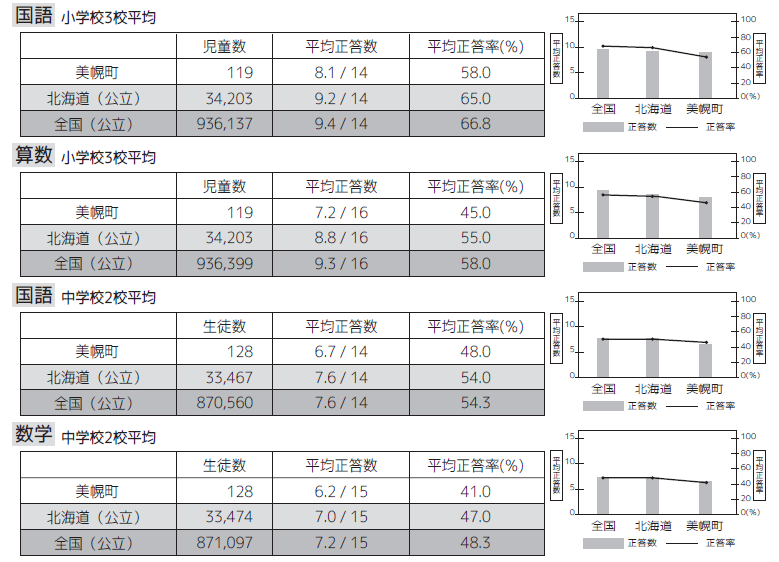 本年度の全国学力・学習状況調査の結果が公表され、町内の小中学校では、国語、算数・数学ともに全国より平均正答数が1~2問程度少ない結果となりました。