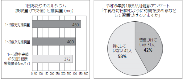 幼児にとってのおやつは、食事ではとりきれないエネルギーや栄養素、水分を補う目的があります。幼児期の発育はとても盛んで、体の大きさに比べて多くのエネルギーや栄養素が必要になります。令和5年度国民健康栄養調査によると、カルシウム摂取量はどの年代においても推奨量に達していません。特に幼児にとって必要なカルシウム量を全て食事からとるのはとても大変です。3度の食事に加え牛乳・乳製品を毎日とることで、骨や歯だけでなく筋肉や心臓のはたらきを正常に保ち、神経系の発達にもつながります。