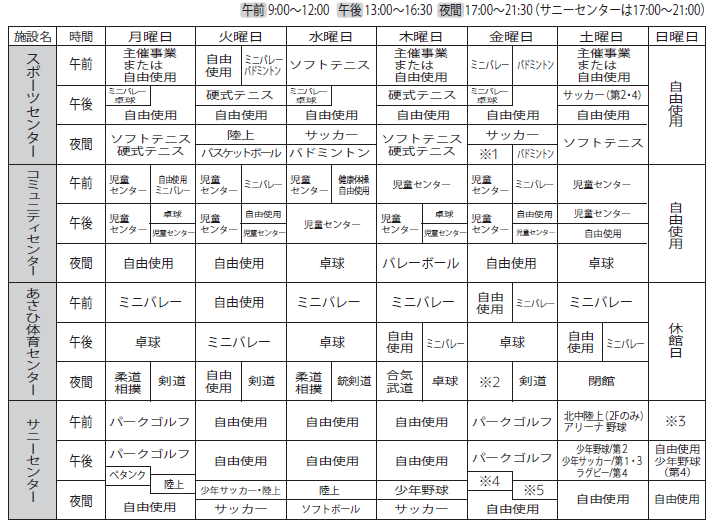 11月1日から来年4月30日までの町内の各運動施設の使用プログラムは次のとおりです。行事等により、内容が変わる場合もありますので確認のうえ、ご利用ください。