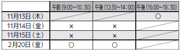 申込は先着順となっていますので、あらかじめご了承ください。申込状況で×と記載してある時間帯でも検査内容により申込が可能な場合もあります。