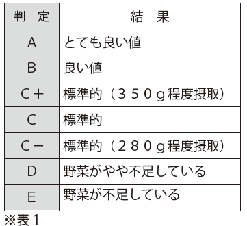 判定結果はAからEまでの7段階で表示され、Aに近いほど野菜がしっかりとれていることを示します。(※表1)