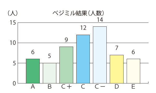参加者で最も多かったのは「C」「C-」の方で、全体の約45%でした。つまり、厚生労働省が野菜の摂取目標量に掲げている1日350gまで「あともう一歩」に該当する方が多いという結果になりました。