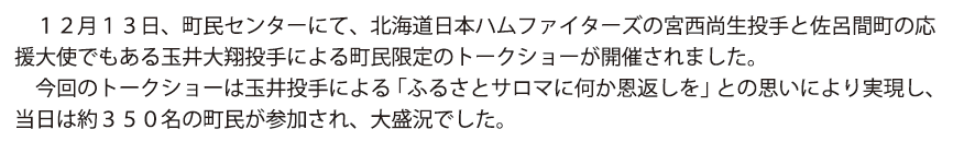 イベント 日本ハムファイターズの宮西・玉井投手によるトークショー開催! 28/32 前の記事 次の記事 発行日 : 2025年12月26日 自治体名 : 北海道佐呂間町 広報紙名 : 広報サロマ 令和8年1月号 Tweet シェアする Baby Face 今月のひとりごと