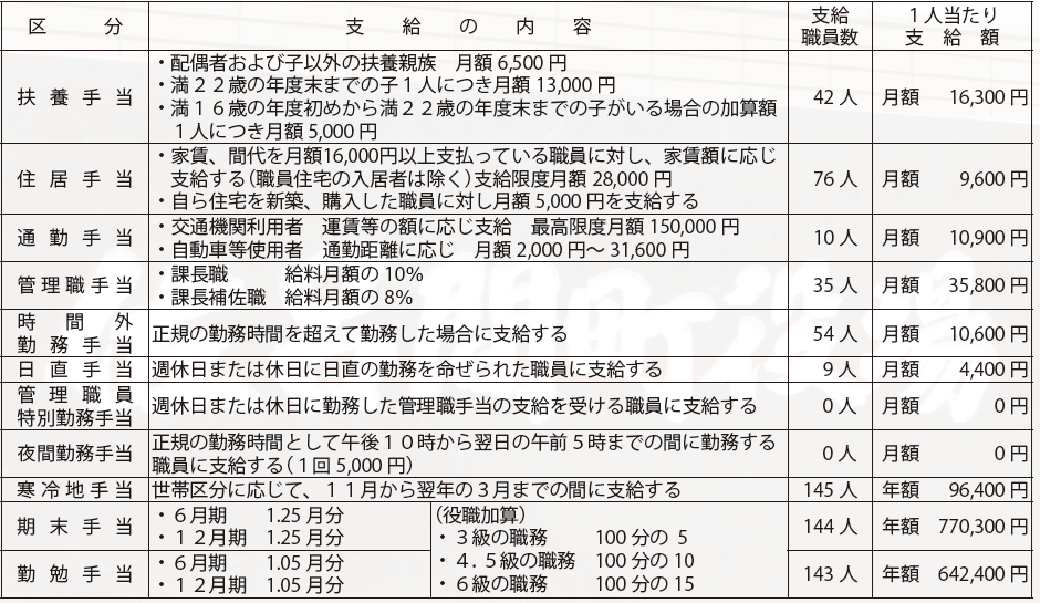 ※時間外勤務手当、日直手当、管理職員特別勤務手当および夜間勤務手当の支給総額にあっては4月実働分支給総額とし、寒冷地手当、期末手当および勤勉手当の支給総額にあっては、令和6年度実支給年額としている。