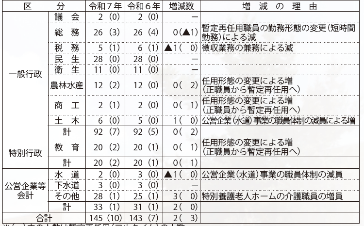 (2)令和7年4月1日における職員数および職員数の増減の状況