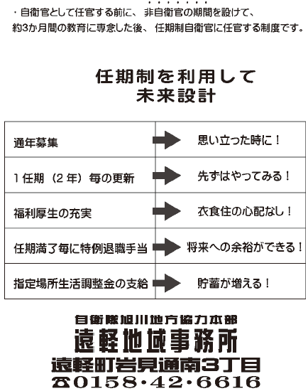 しごと ご存知ですか?「任期制」自衛官とは 11/32 前の記事 次の記事 発行日 : 2025年09月01日 自治体名 : 北海道佐呂間町 広報紙名 : 広報サロマ 令和7年9月号 Tweet シェアする 国民年金便り 町営住宅の空き状況