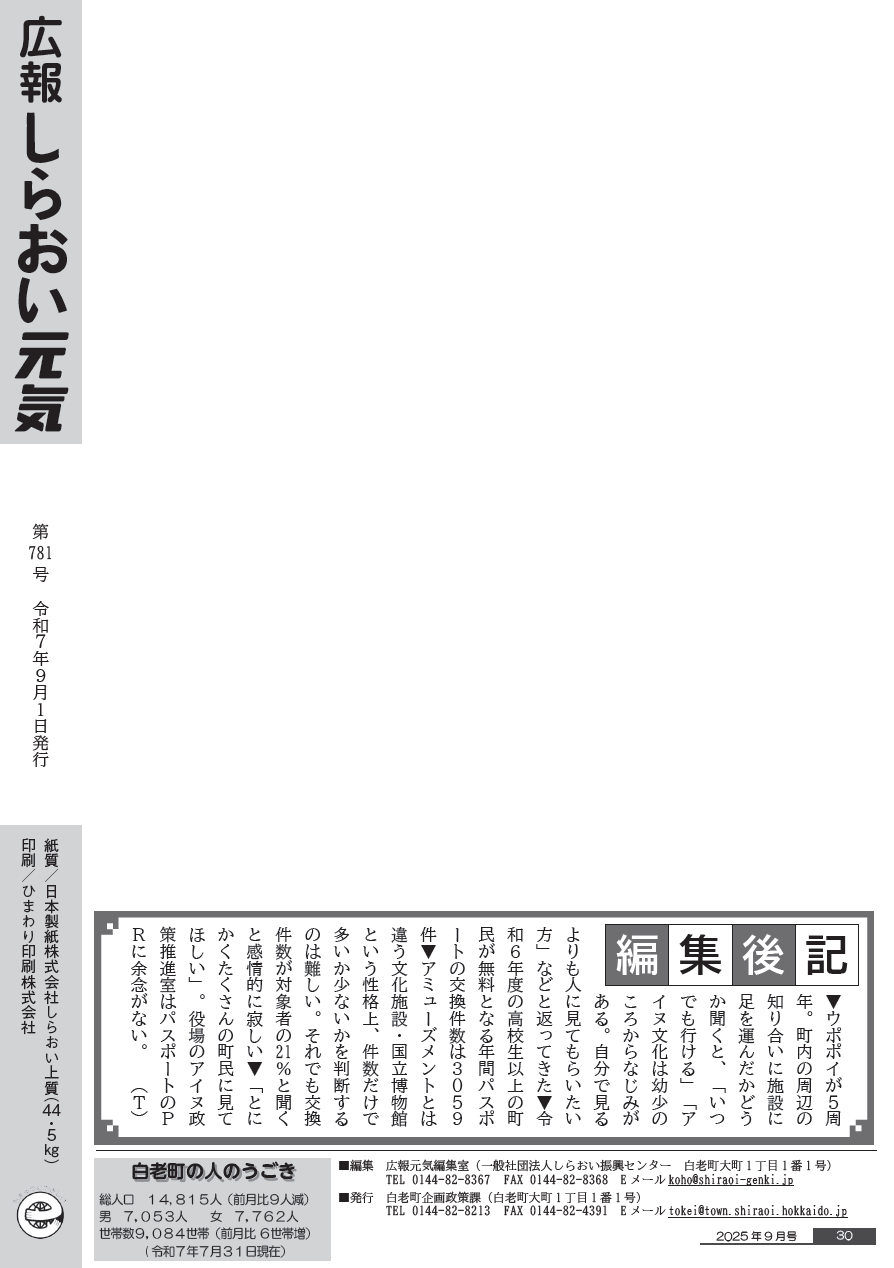 その他 白老町広報「元気」令和7年9月号 P.30 30/30 前の記事 発行日 : 2025年09月01日 自治体名 : 北海道白老町 広報紙名 : 白老町広報「元気」 令和7年9月号 Tweet シェアする 白老町広報「元気」令和7年9月号 P.29