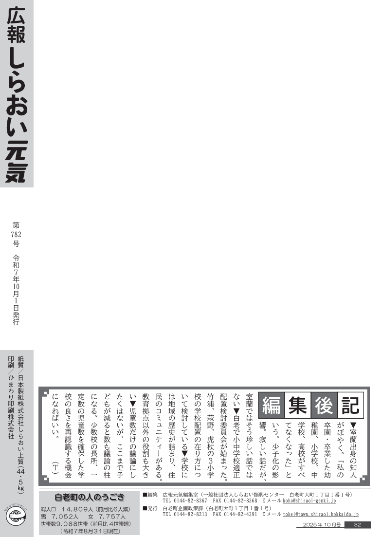 その他 白老町広報「元気」令和7年10月号 P.32 32/32 前の記事 発行日 : 2025年10月01日 自治体名 : 北海道白老町 広報紙名 : 白老町広報「元気」 令和7年10月号 Tweet シェアする 白老町広報「元気」令和7年10月号 P.31