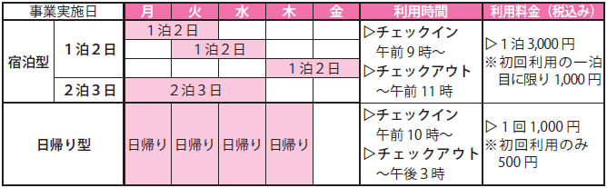 (宿泊型は1泊2日を2日、日帰り型は1回の利用を1日とカウントします)