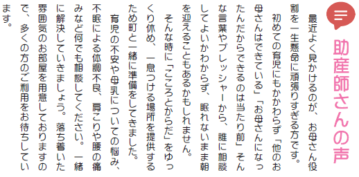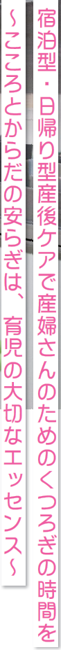 産後ケア事業は、「家事や育児から離れてリフレッシュしたい」「入院中は大丈夫だったのに、家に帰ったら不安になってきた…」など、子育ての疲れやちょっとした不安のある方にぜひ利用してもらいたい事業です。