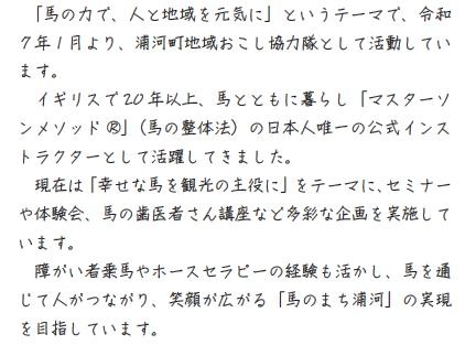 令和7年1月に乗馬療育や観光振興を目的に地域おこし協力隊として着任。